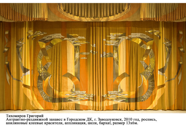 Первый авторский занавес был создан в 2010 году для Городского ДК в городе Заводоуковск Тюменской области из бархата с аппликацией шелком, с росписью в технике холодный батик.