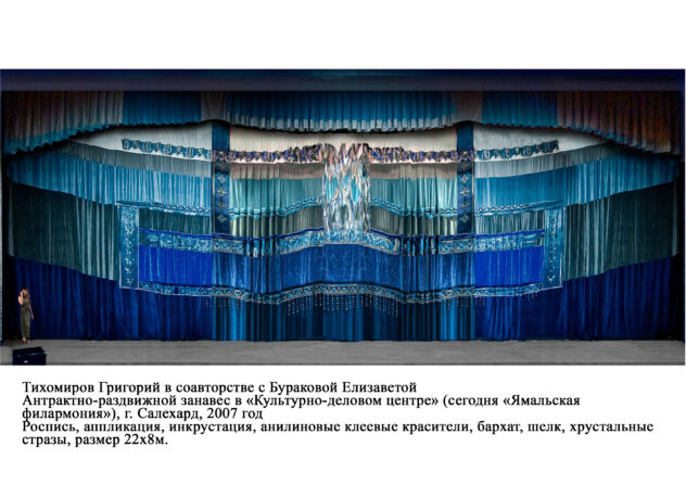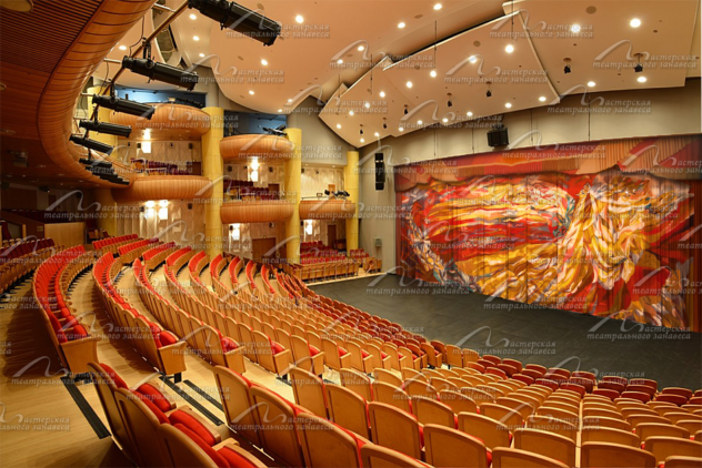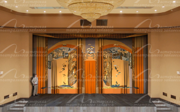 Занавес для Драматического театра им. Ершова в Тобольске – двухкомпозиционный, из шелка в технике холодный батик, с использованием флюоресцентных красителей, невидимых при обычном освещении, светящихся при освещении флюоресцентными лампами (blacklight).